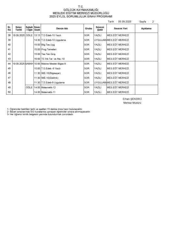 2025 EYLÜL DÖNEMİ SORUMLULUK SINAV PROGRAMI AŞAĞIDADIR.